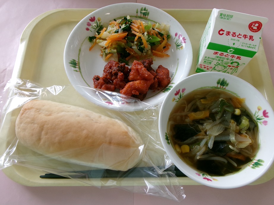 米粉パン、牛乳、とり肉とレバーのケチャップからめ、三色ひたし、わかめスープ