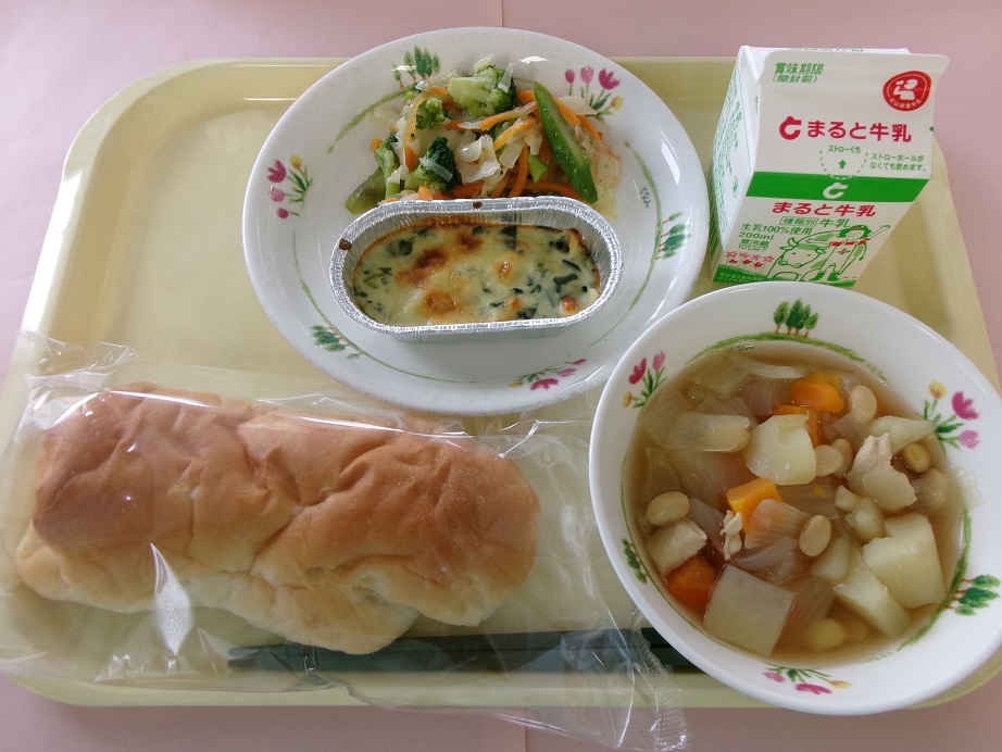 アップルパン、牛乳、ほうれんそうグラタン、アスパラサラダ、ポトフ