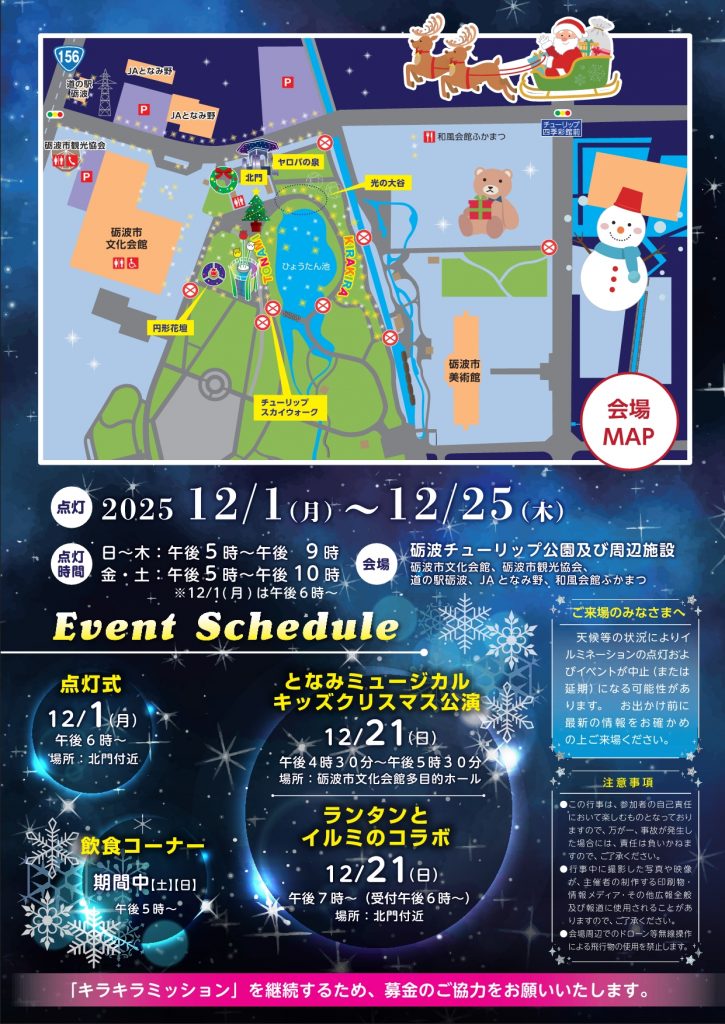 | お問い合わせ先 | キラキラ・アップ実行委員会事務局(砺波市商工観光課内) 電話番号:0763-33-1397 ※平日8:30から17:15まで。休日は、砺波市観光協会(0763-33-7666)へお電話ください。 |